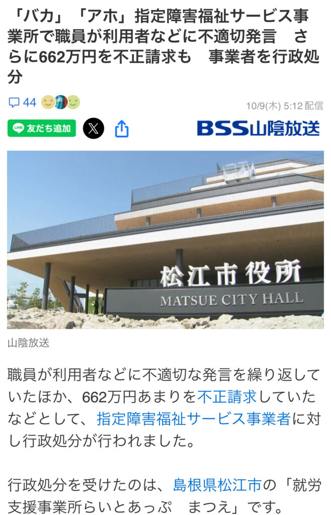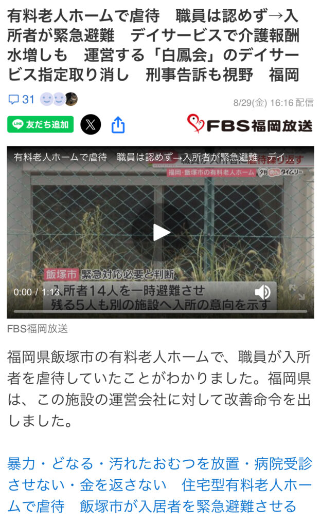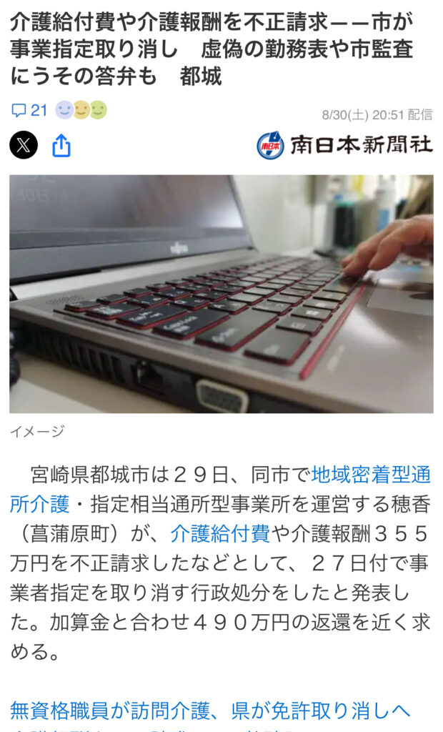 冒頭でも書きましたが、介護施設による不正請求や虐待問題が、ニュースでたびたび取り上げられています。行政から指定取り消し処分を受けた法人や、利用者への暴言・暴力が発覚した事例などは、Yahoo!ニュースなどでも頻繁に報じられています。